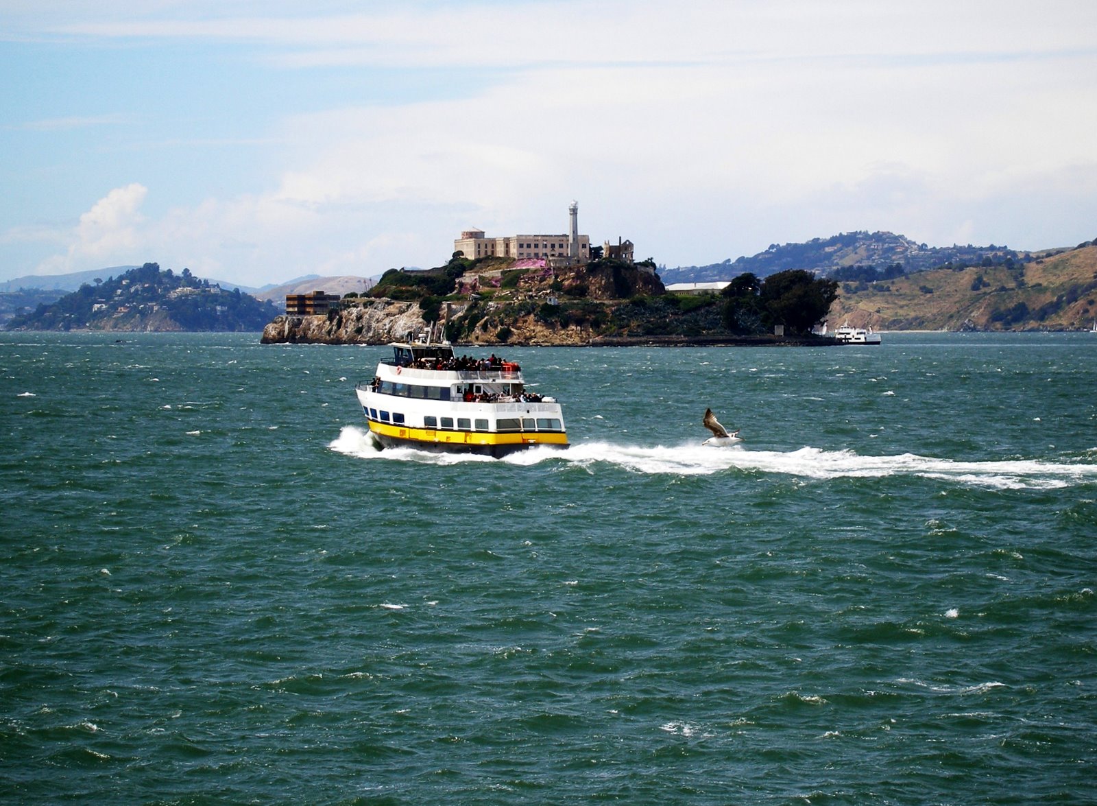 Alcatraz Island in background; tour boat, and a sea gull who happened to fly into my shot when I took the picture. :-)